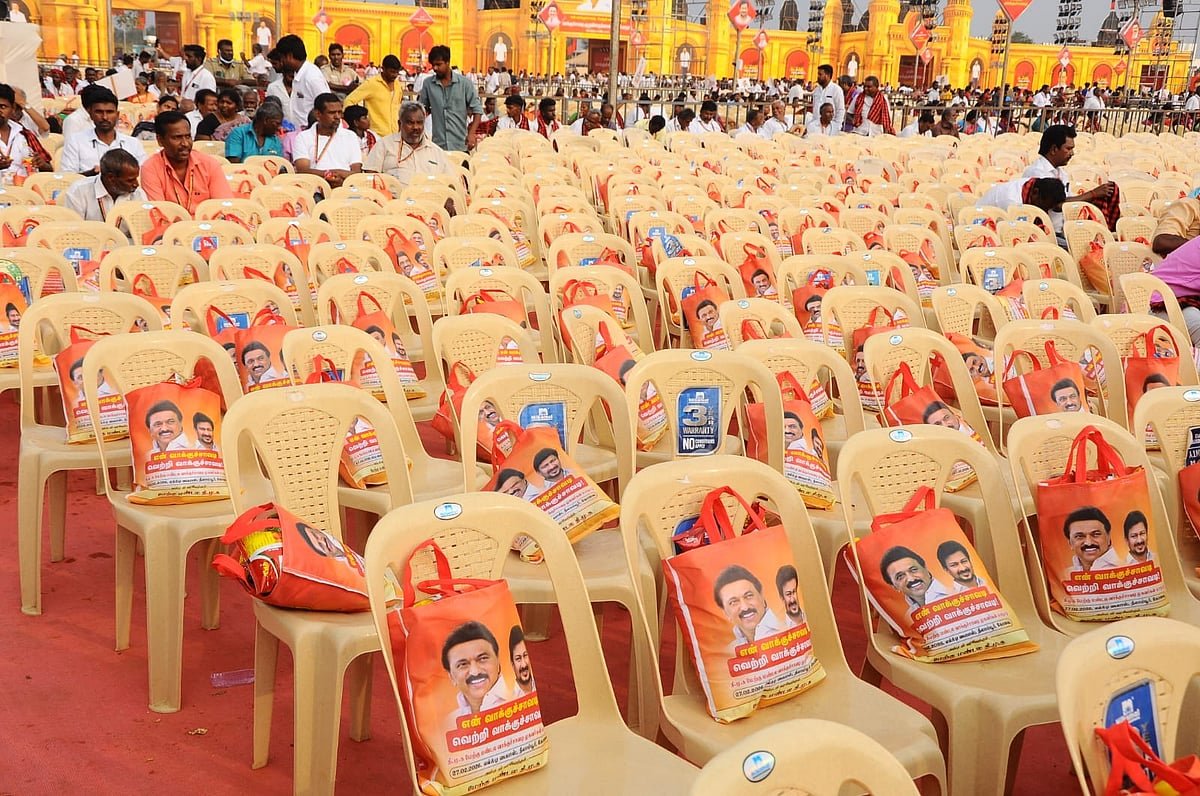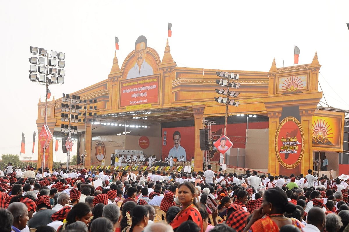 My Voting Booth.. The DMK Voting Booth West Zone Conference for Voting Booth Agents was held yesterday evening in the Neelambur area of Coimbatore district. The conference, held under the leadership of Chief Minister Stalin, was attended by key DMK officials and voting booth agents. Grand arrangements were made over several acres in the Neelambur area for the Coimbatore conference. Bottled drinking water, biscuits, snacks, and packets containing DMK flags were distributed to all participants. From the grand entrance to the stage of the conference, DMK leader M.K.