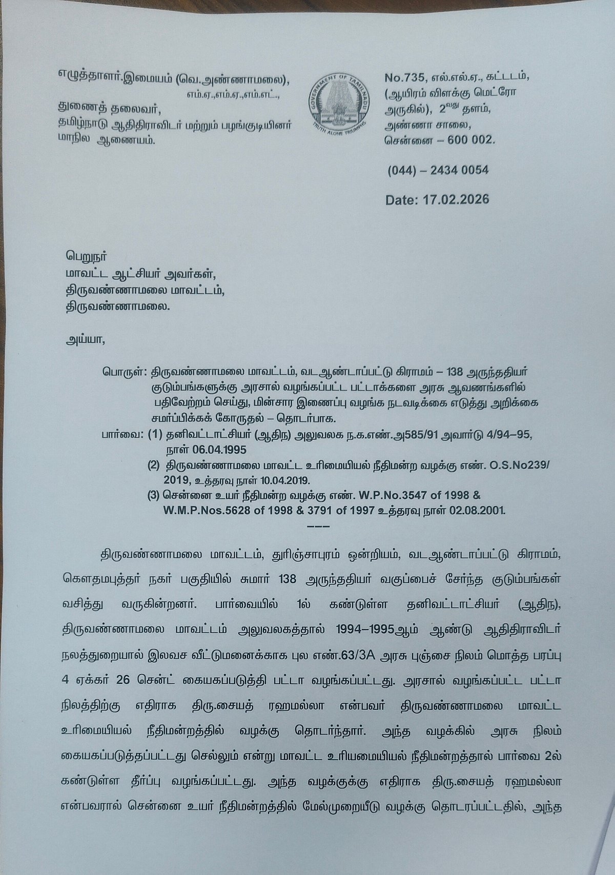 The village administrative officers have not recorded this in government documents until today. Due to the lack of registration, they have been unable to build houses or obtain electricity facilities. It is not appropriate for Gautama Buddha Nagar to be without electricity in 2026. A letter regarding this petition has been sent to the Thiruvannamalai District Collector. Furthermore, a phone conversation about this matter has been held with the esteemed Tamil Nadu Chief Minister's private secretary, Shanmugam IAS,” he said. We hope that light will soon shine in their lives!