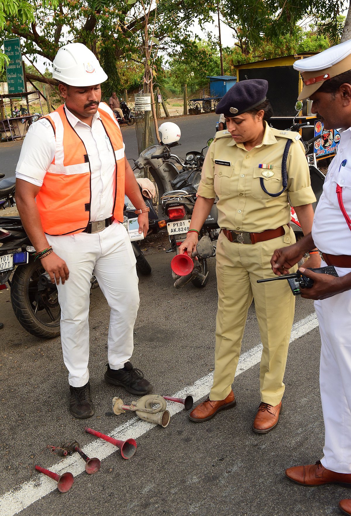 Athivegamaga varum vaaganangale kankaanikkum S.P. Ratchanaa SingaSP thalaimaiyil vaaganangalil adhika oliyai ezhuppum air haarnkal akatrpattana. Akatrpatta air haarnkalai paarvaiyitta SP anumathikkappatta alavai vida adhikam ottappatta karuppu stickersai athiradiyaga akatriya SP Ratchanaa Singa. Adhika oli ezhuppum vaaganangalil air haarn akatrpattu apatharam vidhikkappattadum. Moondru perudan senra iru sakkara vaaganangalku aparadham. Kaavalthuraiyil illamal "POLICE" ena sticker ottiya vaaganangalku aparadham. Pokkuvarathu police aridam vaakkuvaadham seitha vaagana ottigal. Adhika oli ezhuppum vaaganangalil air haarn akatrpattu aparadham vidhikkappattadhu. Athivegamaga varum vaaganangale kankaanikkum S.P.