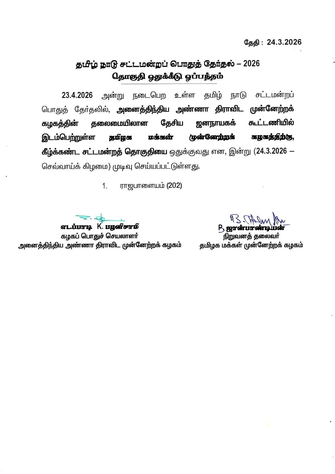 Jaan Paandiyanin T.M.Mu.K katchikku 1 idamum, Thirumaaranin Thennindiya Paarvart Plaak katchikku 1 idamum othukkappattirukkiradhu. Netru (March.24) theerdhal arikkaiyai veliyitta A.Dhi.Mu.K pothucheyalalar Edappadi Pazhanisaami, indru mudarkatta vedpalar pattiyaalaaga 23 thogudigalukku vedpaalargalai arivithirundha nilaiyil, tharpothu kootanik katchigalukkaan thogudhip pangeedu thodarbaana vivarangalaiyum veliyittirukkiraar. 'Ovvvoru kudumbaththukkum vilaiyillaa fridge' - theerdhal arikkaiyai veliyittaar Edappadi Pazhanisaami