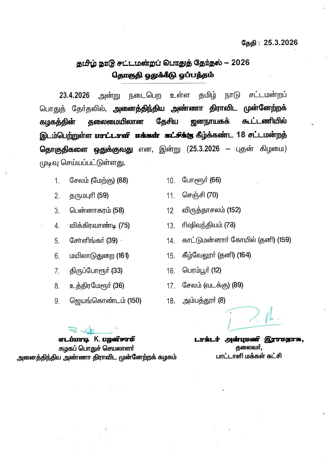 On April 23rd, the legislative assembly election is scheduled to take place in Tamil Nadu. The alliance negotiations for this election began but continued to be deadlocked between the two parties, DMK and AIADMK. In this situation, both parties are finalizing and announcing the allocation of constituencies for their alliance partners. As part of this, in the NDA alliance led by AIADMK General Secretary Edappadi Palaniswami, 27 constituencies have been allocated to BJP, 18 constituencies to PMK led by Anbumani, and 11 constituencies to AMMK led by TTV Dhinakaran. The Tamil Nadu Congress party has been allocated 5 constituencies, and the Indian Democratic Party has been allocated 2 constituencies.