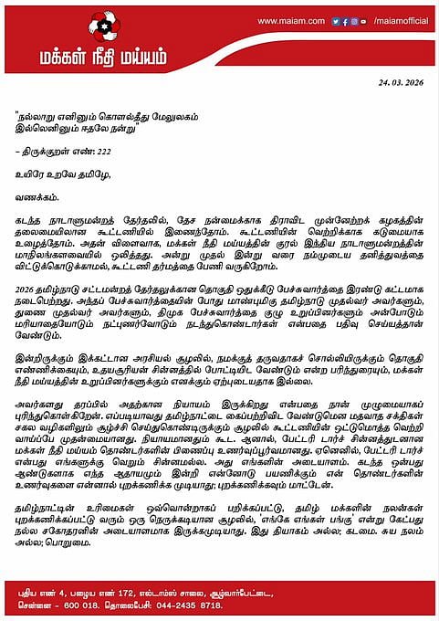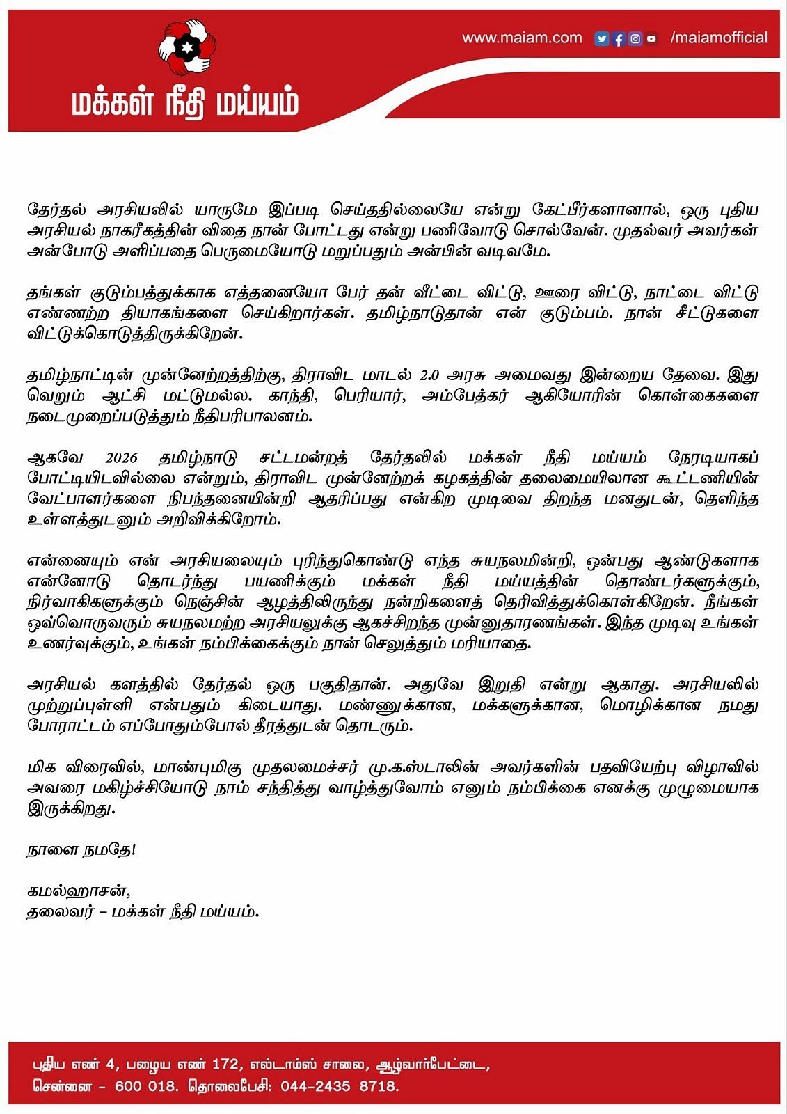 The Tamil Nadu Assembly election is approaching. Parties are intensifying their talks on constituency allocation. In this, the DMK has secured signatures on constituency agreements from its alliance parties such as Congress, Communists, VCK, and DMDK, and has allocated constituencies accordingly. The only remaining party is Makkal Needhi Maiam. In this situation, Kamal Haasan, who came to Chennai Anna Arivalayam, has announced that he will not contest in the Assembly election. The statement he released regarding this is below...