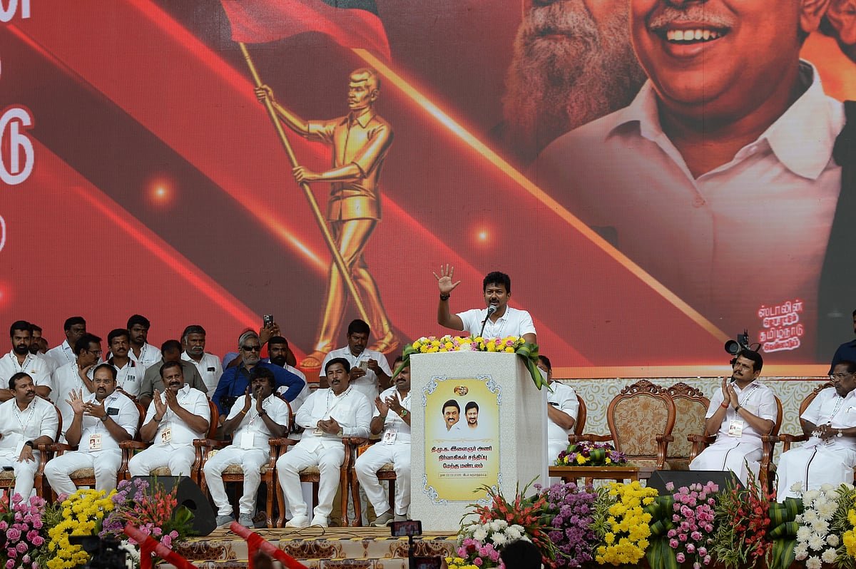 The DMK West Zone Youth Wing administrators' meeting was held in Karumathampatti, Coimbatore district. Speaking at the event, DMK Youth Wing Secretary Udhayanidhi Stalin said, "Today, from the 39 constituencies under the West Zone, about 80,000 administrators have gathered. Seeing your enthusiasm, it is clear that 'In the West... we are the best.' Today, many parties don't even know how many booth committees they have. They are just now taking stock. We have appointed hundreds of thousands of administrators for our booth committees. The Chief Minister, Deputy Chief Minister, Ministers,
