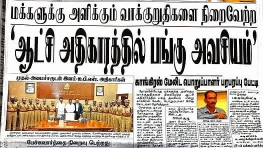 தவிர, ‘அதிகாரத்தில் பங்கு வேண்டும்’ என்ற கோரிக்கையை முதலில் எழுப்பியது, தமிழ்நாடு காங்கிரஸ் மேலிட பொறுப்பாளரான கிரிஷ் சோடங்கர்தான். அவரது பேட்டி, டிச.23-ம் தேதி வெளிவந்த தினத்தந்தி இதழிலில், தலைப்புச் செய்தியாகவும் வெளிவந்தது.