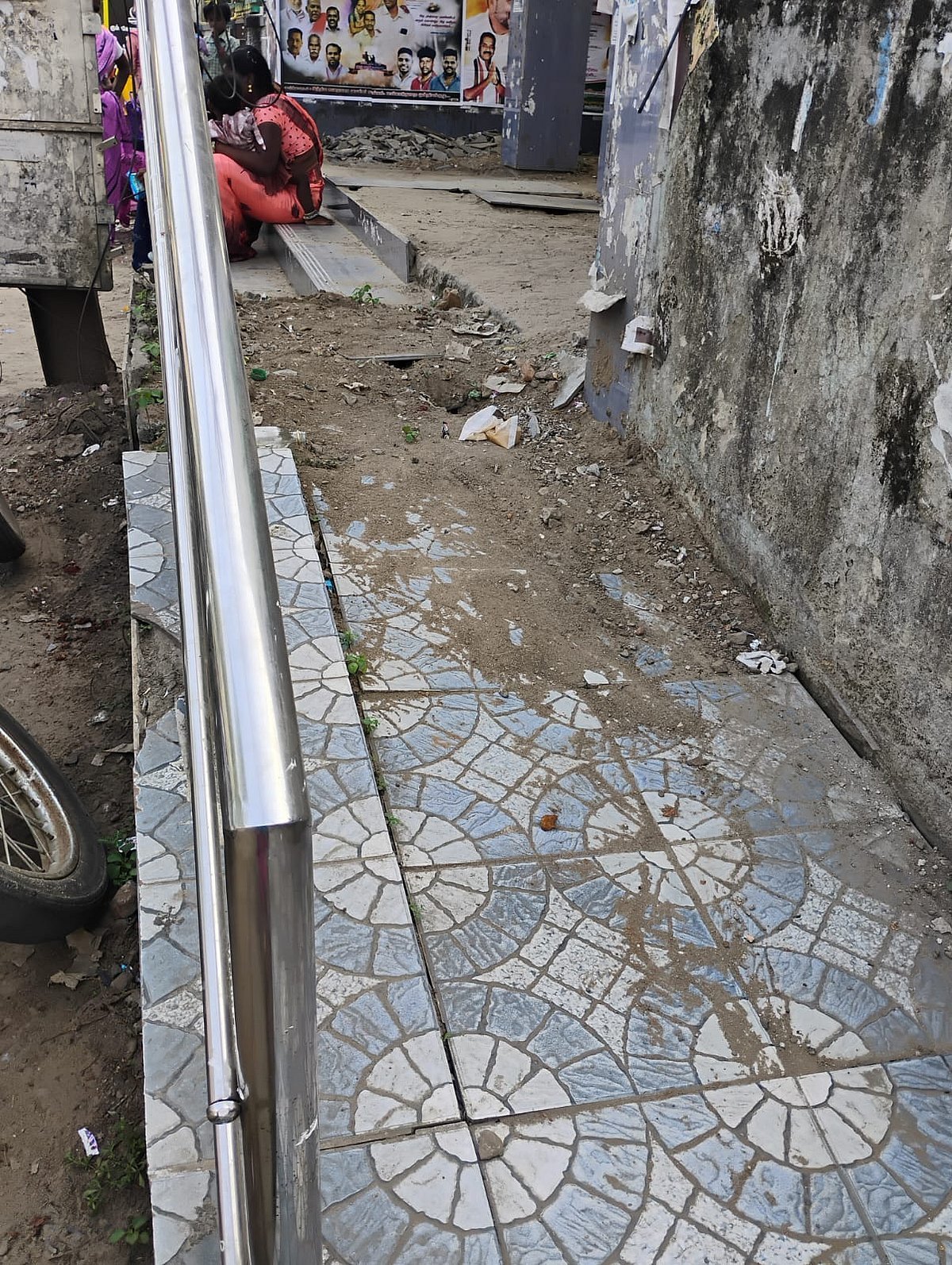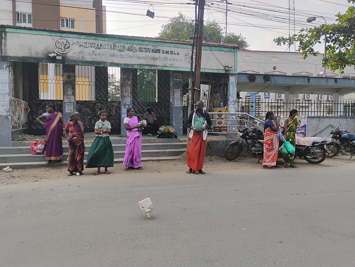 Thousands of people visit the Mayiladuthurai district Government Periyar Head Hospital daily for treatment. All recommendations for advanced treatment from town panchayat, municipal hospitals, and primary health centers are referred only to the head hospital. This head hospital also serves as the main medical support for the people of Mayiladuthurai. However, outside that hospital at the bus stop, the passenger waiting shelter is in a very poor condition. When it rains, the ground becomes so muddy that it is impossible to stand there comfortably. Additionally, there are no seats available for passengers to sit at this bus stop.