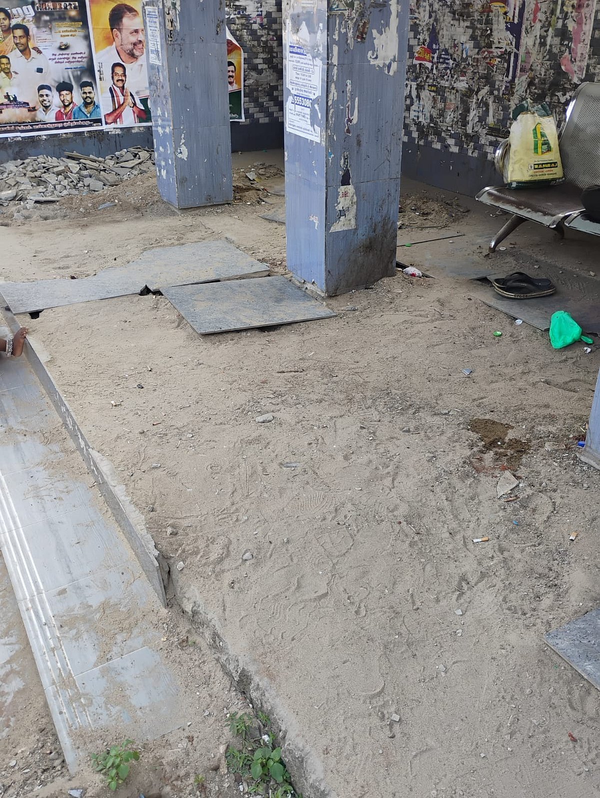 அடிக்கிற வெயில்லகூட நாங்க நின்னுக்கிட்டு தான் இருப்போம். ஏன்னா அந்த பஸ் ஸ்டாப்புக்குள்ள போயி நிக்கக்கூட முடியாது. அந்த அளவு போட்டுக் இருக்குற டைல்ஸ் எல்லாம் உடைஞ்சு காலுலாம் கிழிக்கிற மாறி இருக்கு. நாங்க மட்டும் இல்ல, மாசமா இருக்குறவங்க, குழந்தை வச்சி இருக்குறவங்க, கை கால் முடியாதவங்கன்னு இப்படி உடம்பு முடியாத எல்லாருமே மணிக்கணக்குல கால் கடுக்க நின்னுதான் பஸ் ஏற வேண்டியதா இருக்கு.