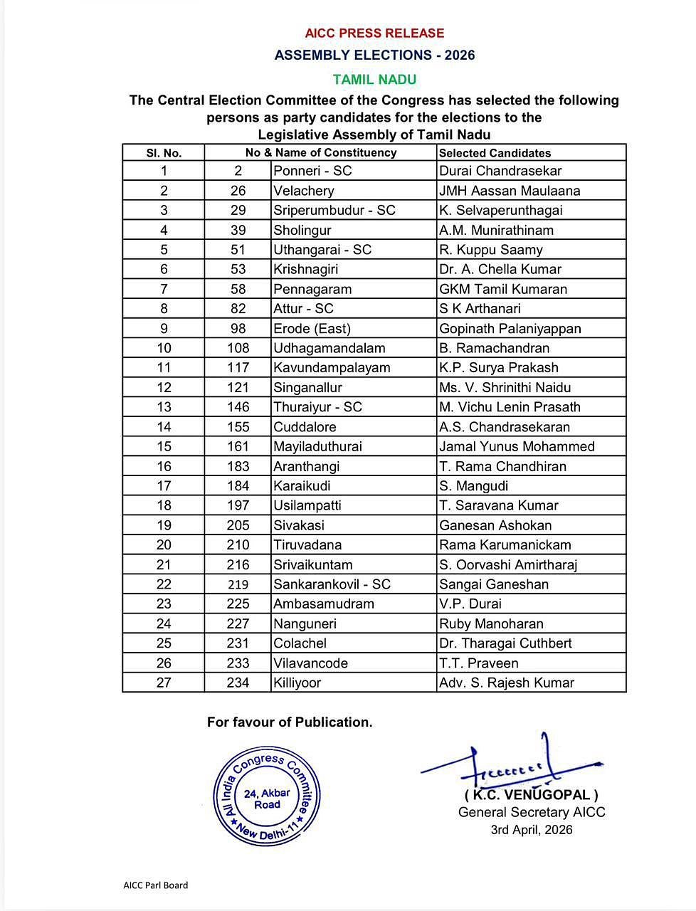 அதன்படி செல்வப்பெருந்தகை ஸ்ரீபெரும்புதூர், வேளச்சேரியில் அசன் மெளலானா, பென்னாகரத்தில் ஜி.கே.எம் தமிழ்குமரன், ஆத்தூரில் அர்த்தநாரி, கவுண்டபாளையத்தில் சூர்யபிரகாஷ், சிங்கநல்லூரில் ஸ்ரீநிதி நாயுடு உள்ளிட்டோர் போடியிடுகின்றனர்.