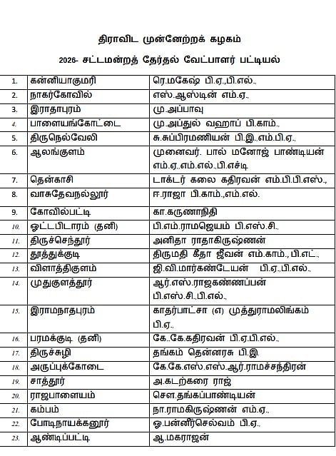 The Tamil Nadu Legislative Assembly election is scheduled to be held on April 23. The vote counting will take place on May 4. In this context, the nomination filing begins on the 30th of this month. Stalin - DMK. Meanwhile, parties including DMK and AIADMK are actively engaged in election campaigns. AIADMK has released its first two-phase candidate list. Currently, Stalin has released the DMK candidate list. Accordingly, Mahesh is contesting in Kanyakumari, Abdul Waquf in Palayamkottai, Manoj Pandian in Alangulam, Appavu in Rathapuram, Anbil Mahesh in Thiruverumbur, and Geethajeevan in Thoothukudi. Senthil Balaji, who contested in Karur, has shifted to the Coimbatore South constituency.