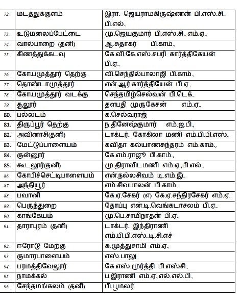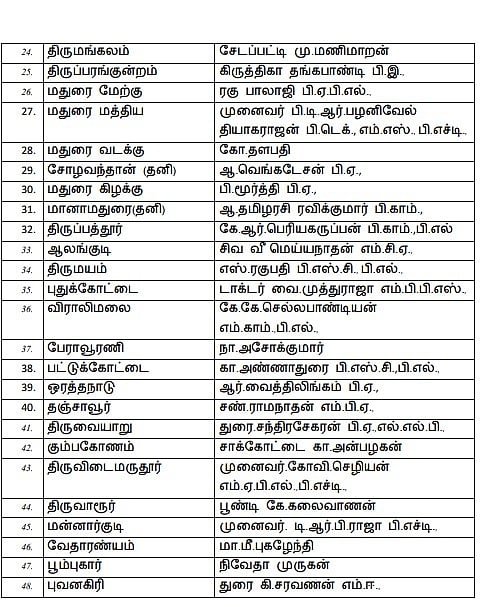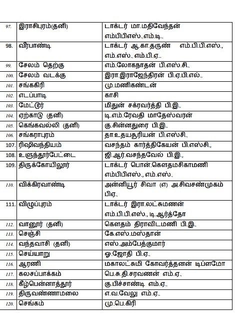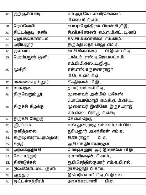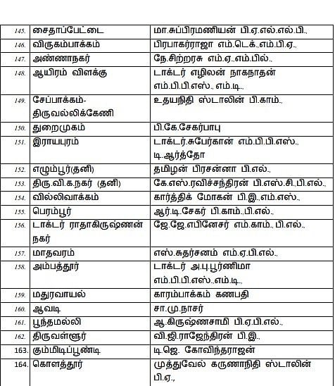 Amaichar Mano Thangarajukku pattiyaLi idam illai. Stalin Kolathur thogudiyilum, Udhayanidhi Stalin Chennai Seppakkam thogudiyilum pottiyidugindranar. Durai Murugan meendum Kaadpaadi thogudiyil pottiyidugiraar. Muzhu pattiyaLin vivaram keezhe kodukkappattulladhu. Sattamanrath theerthalsil pottiyidum DMK vedpaLargalin muzhu pattiyaL!