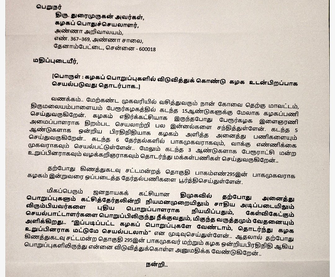The trend of district secretaries and union secretaries appointing people as leaders based on caste has increased. Those who question this are being removed. We do not need such positions. There are a total of 11 polling booths in Malaiyampalayam Municipality. Out of these, 8 people from our party have resigned from their positions and withdrawn. Additionally, some ward secretaries have also resigned. We have written a letter to the general secretary Durai Murugan regarding this,” he said.