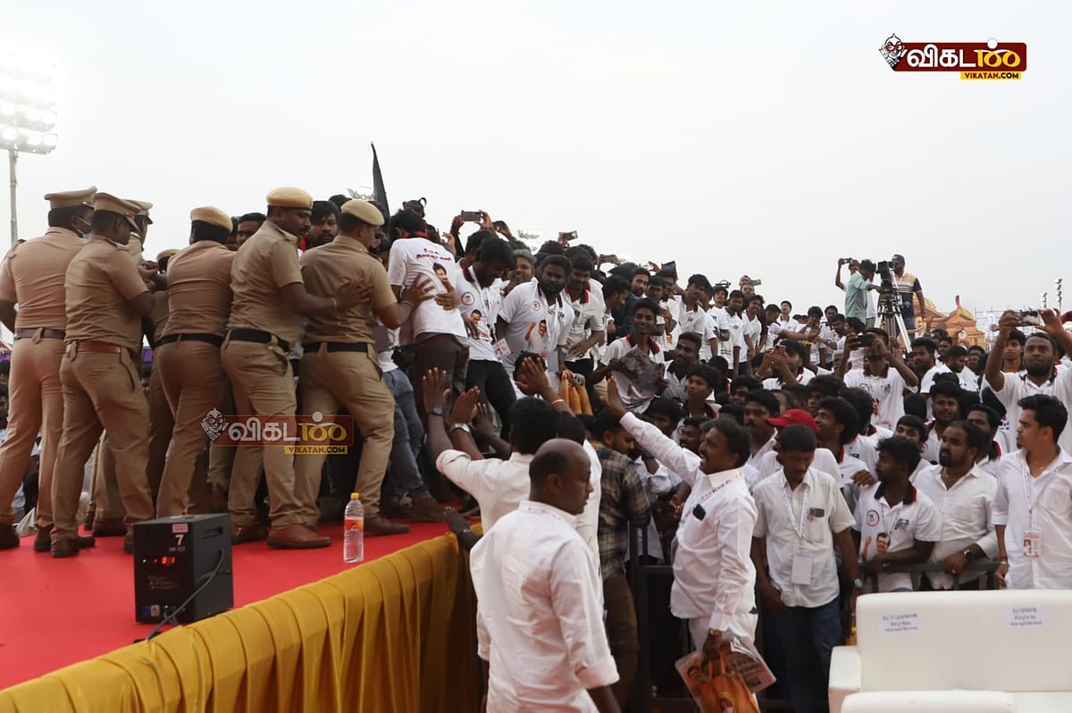 The LED screen was damaged at that time while it was on the test stage with the sniffer dog. Udhayanidhi Stalin planned to come to the stage via a ramp from the entrance. Police officers were stationed on both sides of the ramp, and security was strengthened by testing with the sniffer dog. However, after Udhayanidhi arrived, the police and officials were unable to control the crowd. Many people climbed the ramp, shouted at him, and some grabbed and pulled his hand, causing injury. Udhayanidhi was shocked for a moment, looked at his hand, and then left. The police had a hard time and eventually removed the crowd. Once on the stage, Udhayanidhi washed his hands with sanitizer.