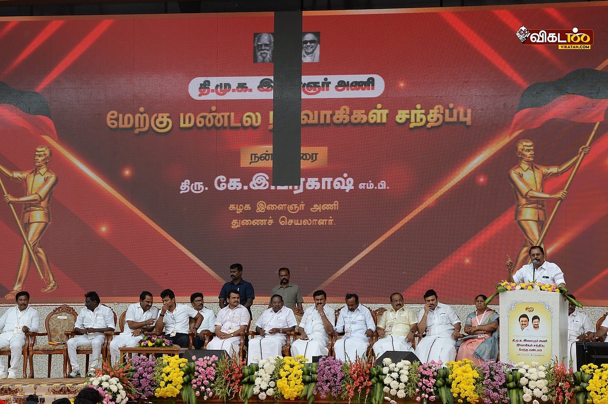 Along with Anna and others, Karunanidhi's photo was kept very small, like a memento. Although it was a meeting of the DMK West Zone Youth Wing administrators, the number of administrators was somewhat limited. People who came from Coimbatore and Karur districts were specially taken care of and brought with vitamins. Among them, many North Indian workers were also seen. Since everyone was given a T-shirt with Udhayanidhi's photograph, there was no visible difference. Senthil Balaji arranged chicken biryani and egg dinner for everyone who came to the meeting. They were brought only in government buses and buses belonging to educational institutions.