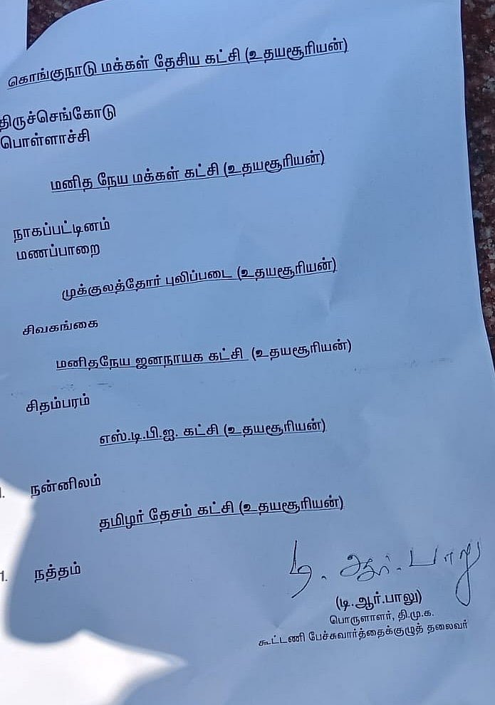 டி.ஆர் பாலு திமுக கூட்டணியில், கூட்டணி கட்சிகளுக்கு ஒதுக்கப்பட்ட தொகுதிகளின் பட்டியலை வெளியிட்டிருக்கிறார்.