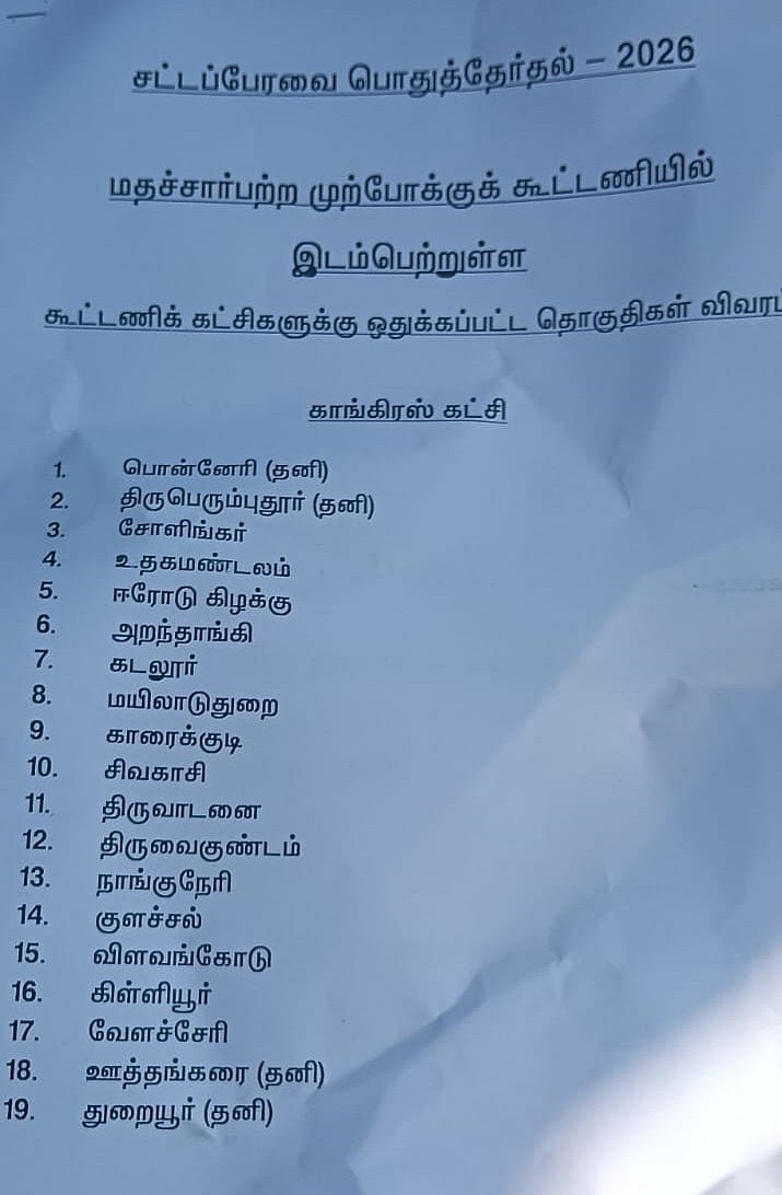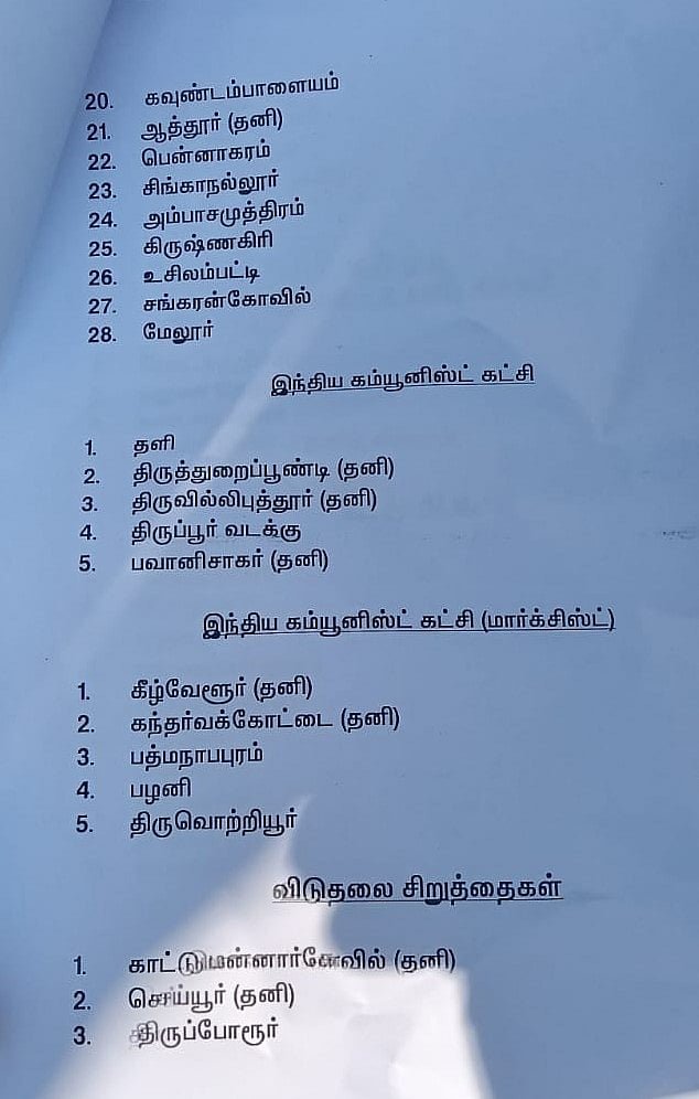 The Tamil Nadu Legislative Assembly election is scheduled to be held on April 23. Vote counting will take place on May 4. In this context, the nomination filing begins on the 30th of this month. Stalin - DMK. Meanwhile, parties including DMK and AIADMK are actively engaged in election campaigns. AIADMK has released its first two-phase candidate lists. T.R. Balu, from the DMK alliance, has released the list of constituencies allocated to the alliance parties. The full list details are below...